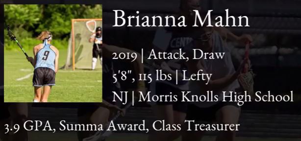 “Bri Mahn is a smart, dedicated athlete who is team oriented and always gives 100%. As a former coach, I’ve seen Bri’s effort result in significant skill improvements. Equally important is Bri’s attitude which is outstanding and her commitment to lacrosse, immeasurable. Bri would be an asset to any team.” – Robert Bilotti